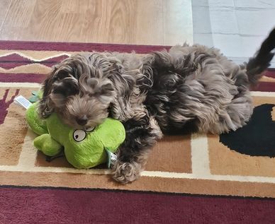 Hi Becky, this is Raffi from Penny's June 2020 litter. He's just over a year & a great dog! Just as you said: he weighs about 16lbs, is quiet, loves to snuggle and everyone loves him! Thanks again. Still loves cow toy you gave. Hope you & family are well Kathy